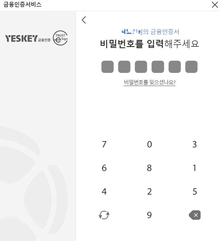 - 로그인이나 인증이 필요한 곳에 금융인증서로 인증을 선택하시고, 위에서 만든 비밀번호 숫자 6자리를 입력하면