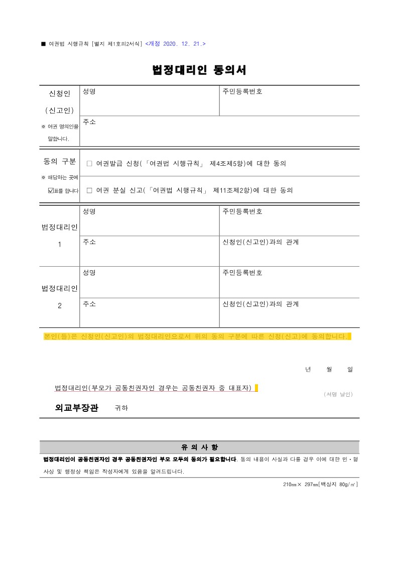 법정대리인의 동의서는 다른 대리인이 방문신청하셔야 하거나, 시간절약을 위해 미리 작성하실 수 있습니다.