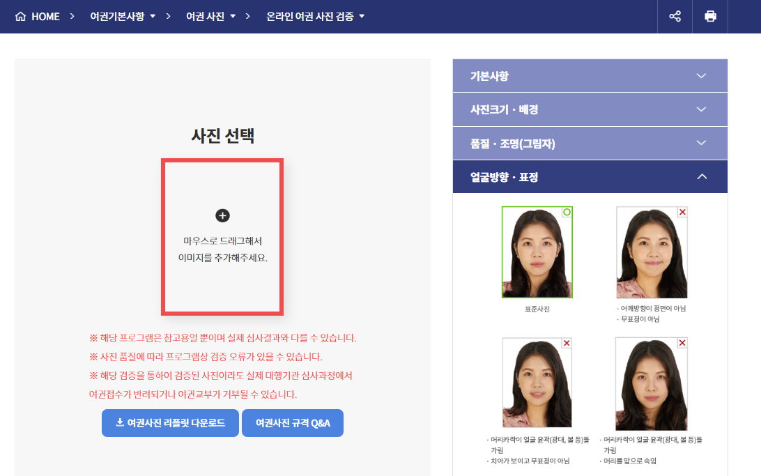 업로드하는 사진이 여권 사진 규격에 맞는지 반드시 확인해야 합니다. 부적절한 사진은 신청 반려의 주요 원인이 됩니다.
