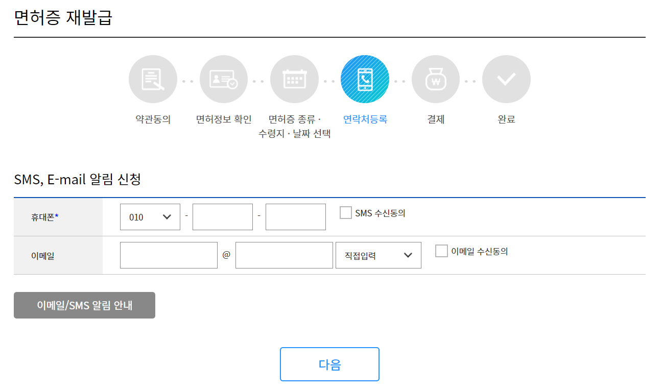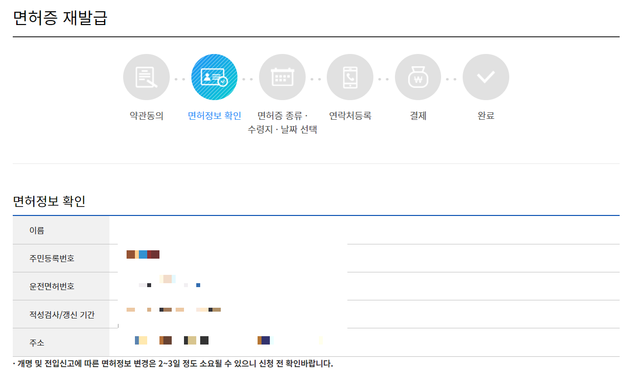 2. 개인 인증 후 재발급 절차 진행 > 결제 > 지정한 날짜에 면허증 수령